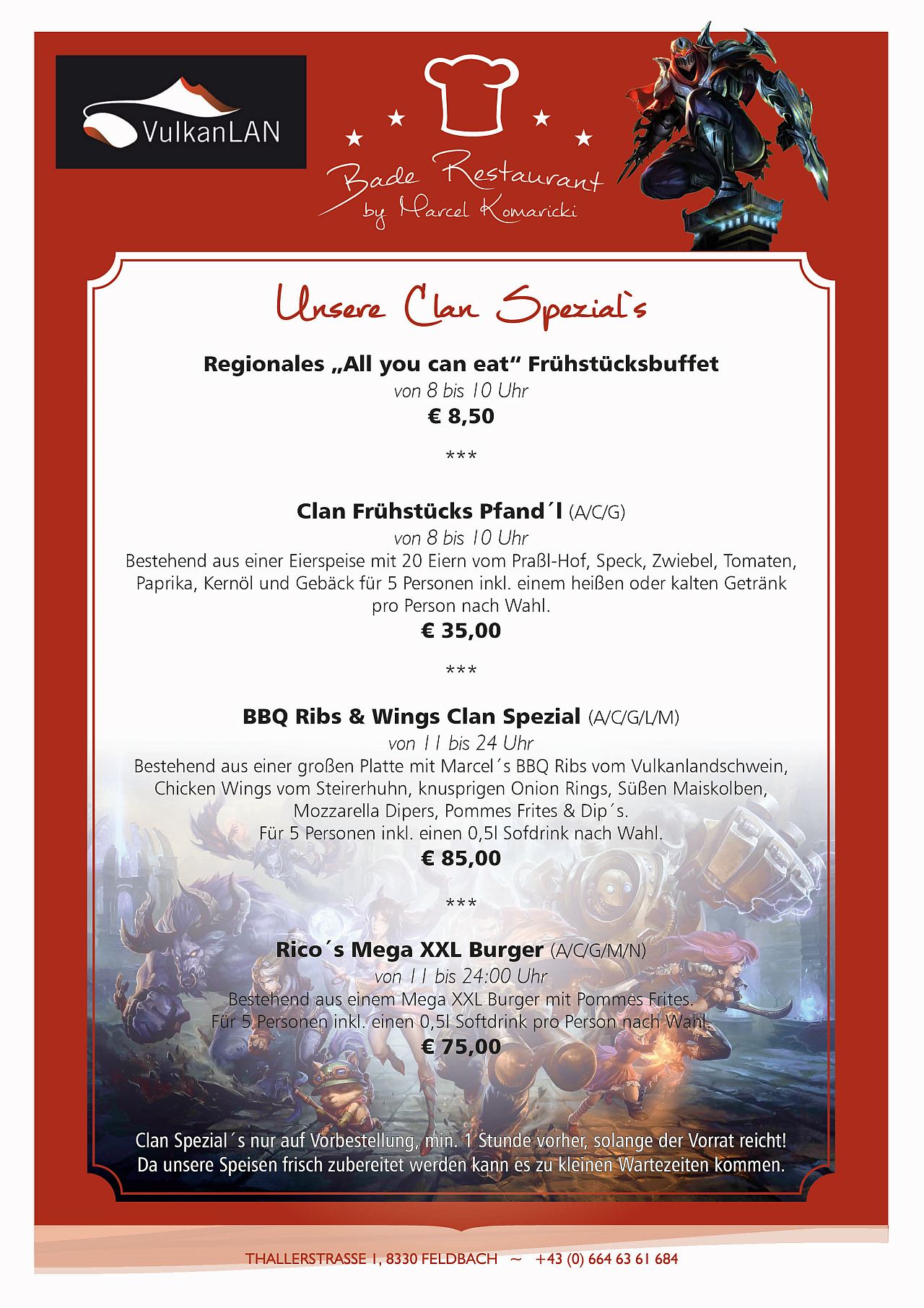 Auch dieses Jahr freuen wir uns schon auf euch. Es ist wohl die einzige LAN, die so großen Wert auf Kulinarik und das Wohl der Gäste legt. Das macht uns besonders stolz und darum geben wir unser Bestes. Wir werden euch fast rund um die Uhr mit regionalen Speisen, Snack´s und Süßigkeiten verwöhnen. Damit Ihr euch voll und ganz dem Zocken widmen könnt, werden wir euch in der Früh schon ein regionales Frühstücksbuffet anbieten, später ein leckeres Mittagessen und zu fortgeschrittener Stunde ein gemeinsames Abendessen mit dem Clan. Ihr könnt euch somit das ganze Wochenende zumindest kulinarisch voll und ganz auf uns verlassen.